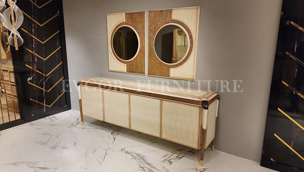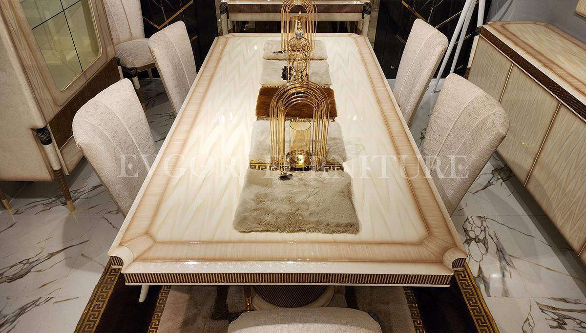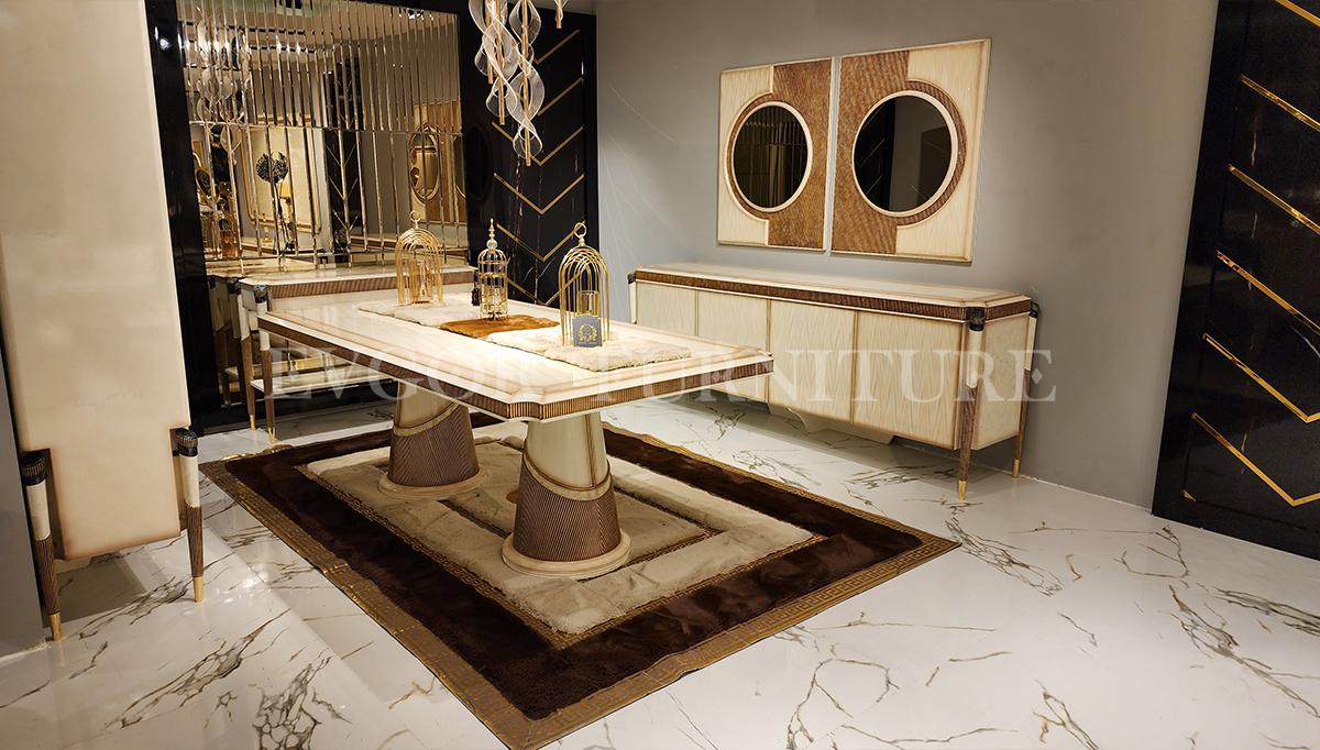 “غرفة طعام فاخرةSirius” جزء من مجموعة الأثاث الفاخرة “إيفجور” والتي يتم إنتاجها بواسطة حرفيين ماهرين باستخدام أفضل المواد الخام. نحن نولي اهتمامًا كبيرًا لمراقبة جميع عمليات الإنتاج بدقة، وتغليف كل قطعة بعناية فائقة وشحنها باستخدام شركات معتمدة وموثوقة. نحن نقدم أيضًا حلولًا ديكورية فريدة من خلال فريقنا المتخصص في التصميم الداخلي، لتحقيق أحلامك ومزج ذوقك مع احتياجاتك. جميع قطع الأثاث في مجموعة “إيفجور” تأتي مع ضمان 100%، وإذا كنت بحاجة إلى خدمة ما بعد الضمان، يمكنك الاعتماد على خدمتنا الممتازة.