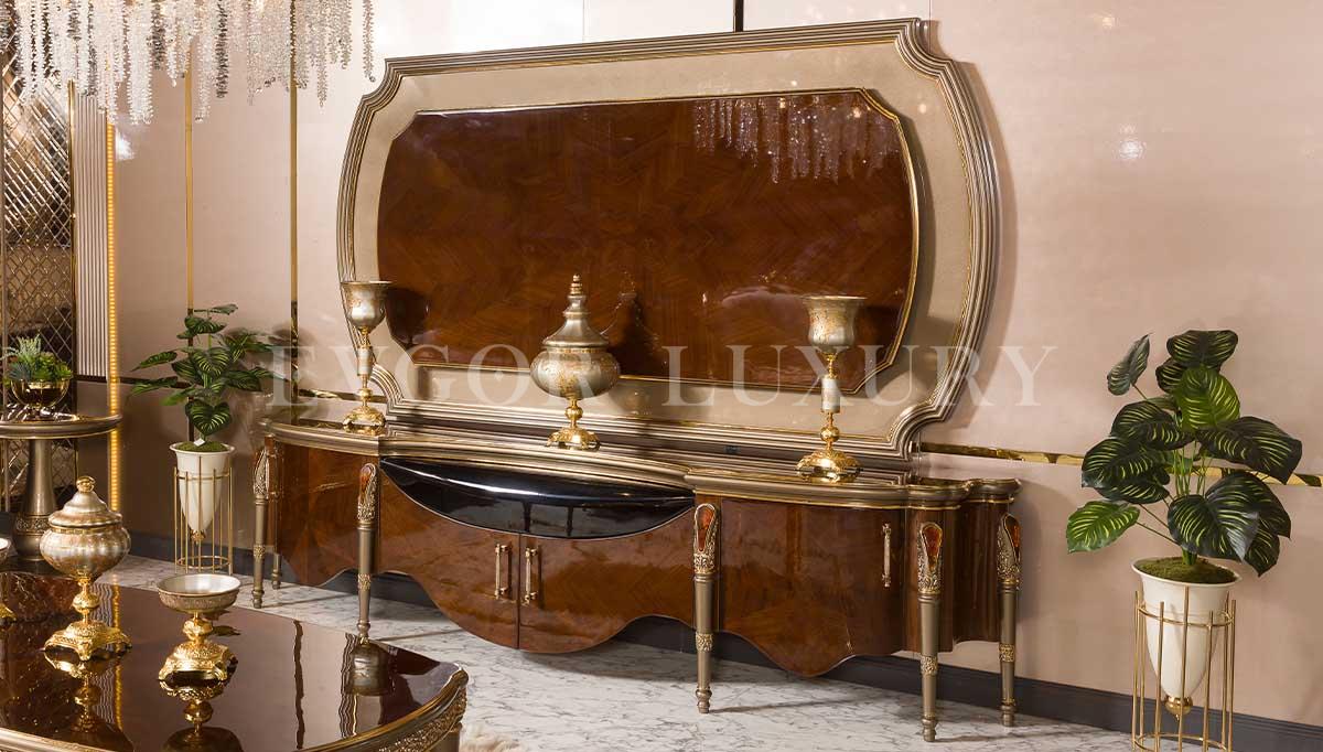 L’ensemble de Barbaros Salle à Manger de Luxe a été spécialement conçu pour la collection Evgor Furniture par des artisans qualifiés utilisant des matériaux de première qualité dans les moindres détails. Dès le moment de la commande, tous les processus de production sont méticuleusement suivis. Chaque meuble qui sort de la production est soigneusement emballé et expédié dans le monde entier par des entreprises sous contrat avec assurance.