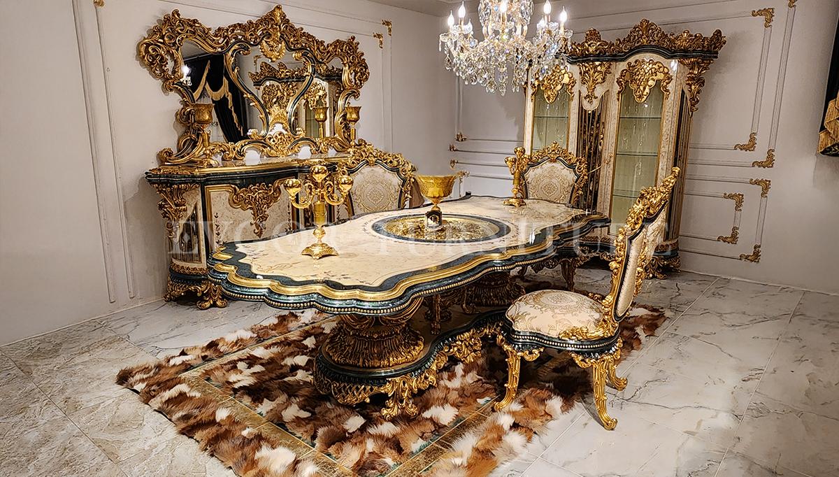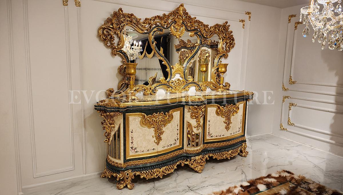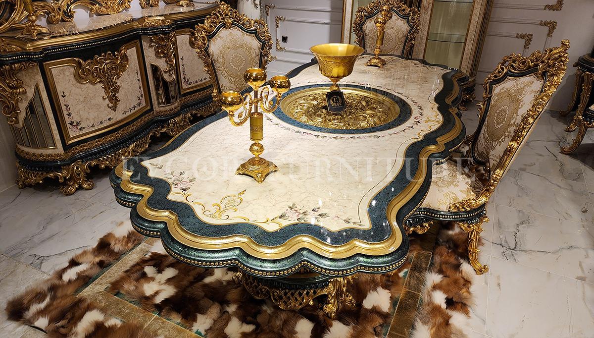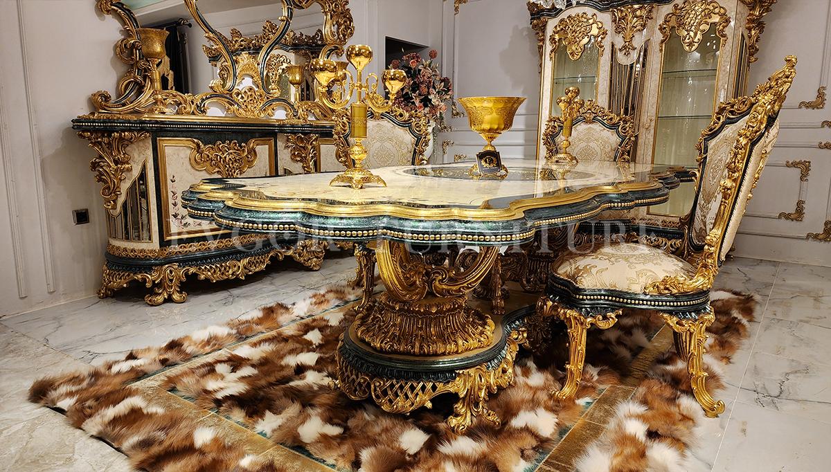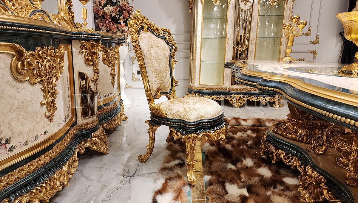 The Nazende Green Classic Dining Room specially designed furniture that in the Evgor Furniture collection is produced by skilled craftsmen using first class materials in every detail. From the moment of order, all process of production are meticulously followed. Every piece of furniture that comes out of production is carefully being packaged and shipped to the whole world by contracted companies under insurance.